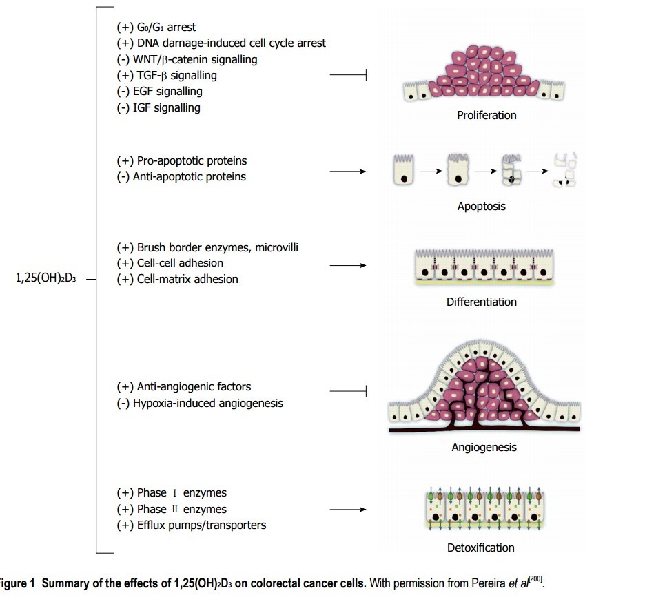 Figure 1: Summary of the effects of 1,25(OH)2D3 on colorectal cancer cells. With permission from Pereira et al[200].