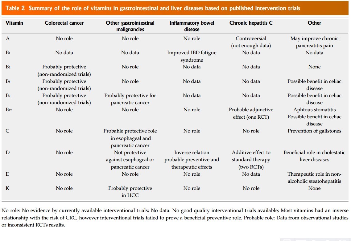 A tremendous amount of data from research was published over the past decades concerning the roles of different vitamins in various gastrointestinal diseases. For instance, most vitamins showed an inverse relationship with the risk of colorectal carcinoma as well as other malignancies like gastric and esophageal cancer in observational trials, however interventional trials failed to prove a clear beneficial preventive role. On the other hand, more solid evidence was obtained from high quality studies for a role of certain vitamins in specific entities. Examples for this include the
