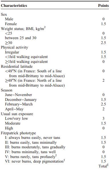 | 1.5 | female sex, overweight, low physical activity, winter season moderate sun exposure, very fair or dark skin |