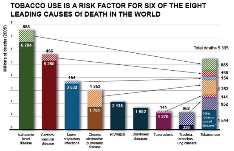 - "Not only do cigarettes cause six million annual deaths – and rising – they hit healthcare and productivity hard around the world..."
