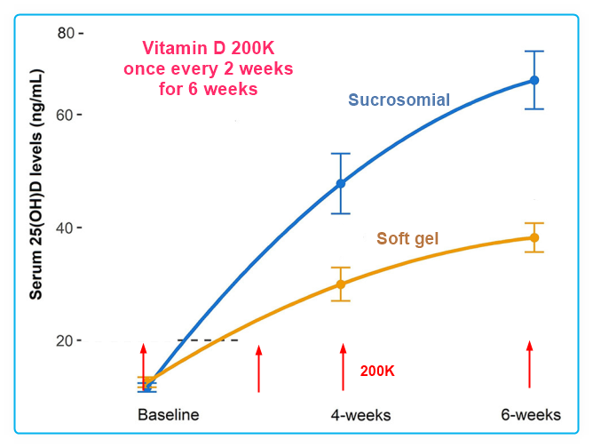- A comparative absorption study of sucrosomial® orodispersible vitamin D3 supplementation vs. a reference chewable tablet and soft gel capsule vitamin D3 in improving circulatory 25(OH)D levels in healthy adults with vitamin D deficiency—Results from a prospective randomized clinical trial