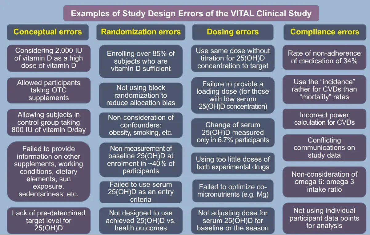 Results: Inappropriate or flawed study designs were frequent in clinical trials. Major failures discussed here include too short clinical study duration, inadequate or infrequent doses, insufficient statistical power, failure to measure baseline and achieved levels, and recruiting vitamin D-sufficient participants. These design errors have led to misleading interpretations. Thus, conclusions from such studies should not be generalized or used in guidelines, recommendations, or policymaking.