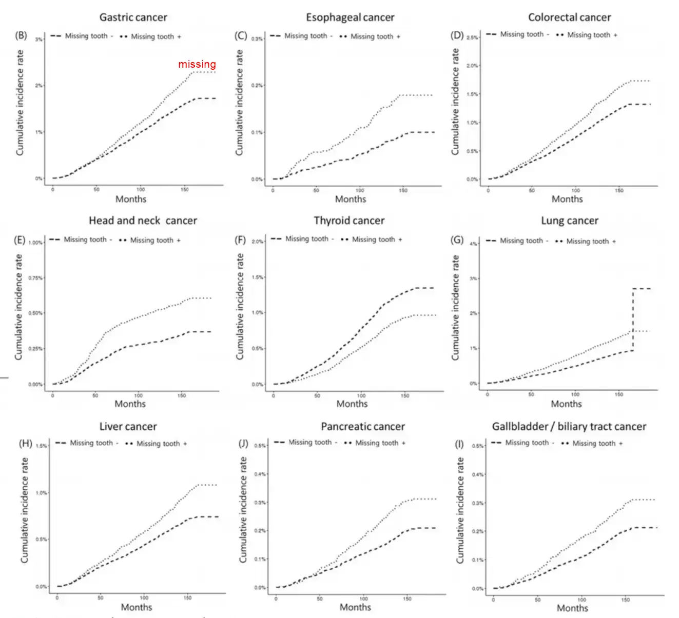- Missing teeth increase risk of several cancers by 30% (Korea) - June 2023