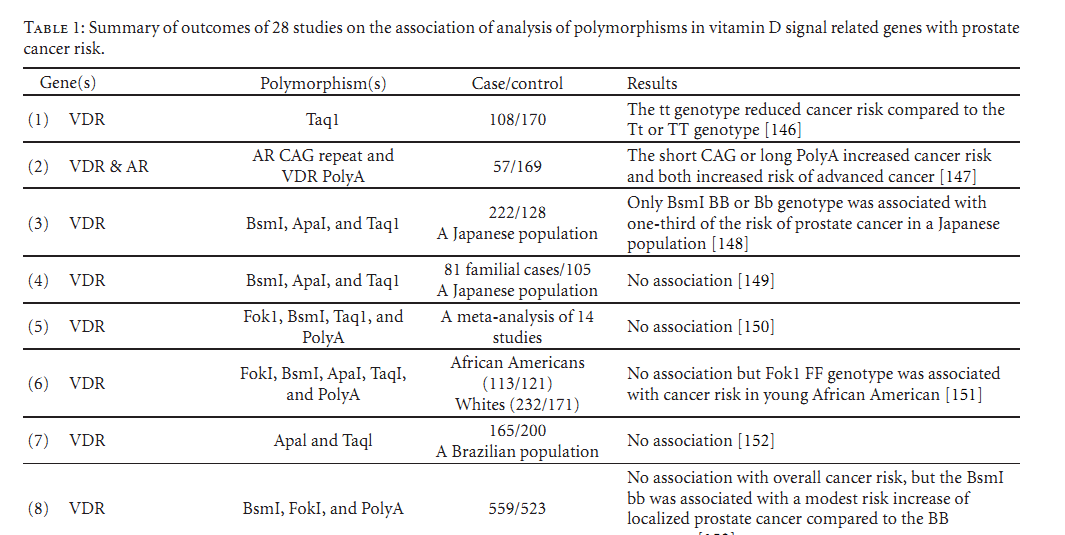 Indeed, genetic heterogeneity effects of vitamin D signaling related genes, especially the VDR gene, have been attractive research subjects for cancer risk studies and potential applications in cancer prevention strategy. Although there are many of this type of epidemiological analyses [106, 146–172] as listed in Table 1, the apparent question is whether genetic variants of those genes involved in vitamin D pathways have real effects on prostate cancer risk. However, as shown in Table 1, the outcomes remain inconsistent and perhaps conflicting and require further studies.