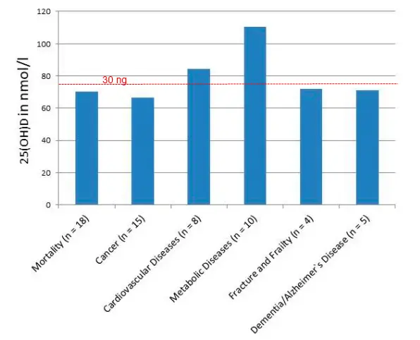 Vitamin D is very important for bone metabolism as well as for the prevention of various diseases, such as type 2 diabetes, cardiovascular disease and different types of cancer. Although vitamin D deficiency is widespread and an important public health problem, there exists controversy in the scientific community, with no established standard definition of adequate and deficient vitamin D status. To add new information on this topic, the aim of this brief opinion paper is to identify and discuss the optimal 25(OH)D concentration (range) for a reduction in the risk of various disease outcomes by summarizing dose–response reporting meta-analyses.