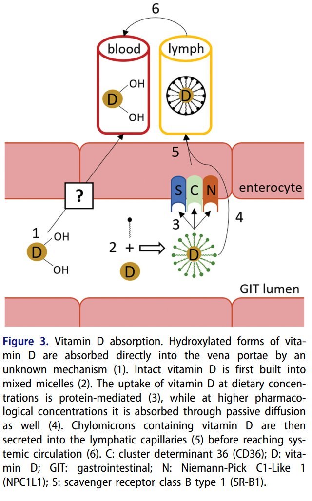 As mentioned above, the current human population is more dependent on dietary intake of vitamin D to achieve the recommended serum level due to the modern way of life [15]. Since vitamin D is liposoluble, it is assumed to share the fate of lipids, especially with its precursor cholesterol, in the human gastrointestinal tract, including emulsification, solubilization in mixed micelles, diffusion through the water layer, and permeation through the enterocyte membrane. However, this theory does not fully correspond to observed kinetics, because the absorption efficiency of vitamin D is lower and more variable than that of triacylglycerols [12,80].