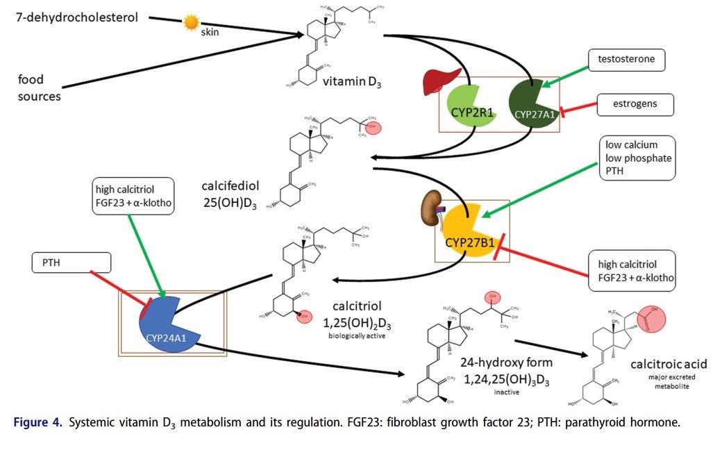 Returning to the main cascade, the production of calcitriol in the kidneys is crucial for mineral homeostasis and bone metabolism, and it is strictly controlled in humans. Calcitriol directly inhibits CYP27B1 in the kidneys [135-138]. On the other hand, parathyroid hormone (PTH), for which release is induced by hypocalcemia, stimulates CYP27B1, resulting in elevation of calcitriol production. As negative feedback, calcitriol suppresses PTH release from the parathyroid glands by upregulation of calcium-sensing receptors and increasing calcium levels in serum [139]. Direct inhibition of PTH release by calcitriol/VDR complex has also been discovered [140]. The other regulation pathway is through fibroblast growth factor 23 (FGF23), produced by osteoblasts and osteocytes, that acts as a regulator of vitamin D metabolism through phosphate serum level. During hyperphosphatemia, FGF23 together with its cofactor a-klotho stimulates phosphate excretion in the kidneys, inhibits CYP27B1, and increases expression of CYP24A1, therefore lowering calcitriol concentration in plasma. In turn, calcitriol stimulates FGF23 expression [141-143]. It has been shown that CYP27A1 is downregulated by estrogens and upre- gulated by testosterone in liver-based HepG2 cells [144]. However, it must be emphasized that the regulation by sex hormones is by far more complicated, and contrarily, a decrease in calcium absorption and an increase in urinary calcium loss have been described in post-menopausal women [145]. Of note, it was reported that estrogen loss may reduce VDR expression [146], but evidence also shows that the estrogen effects in calcium absorption are vitamin D-independent, mediated by nuclear estrogen receptors [147]. In addition,the metabolism of vitamin D is dependent on magnesium level, which is a cofactor for CYP2R1, 27B1, and 24A1 [148].