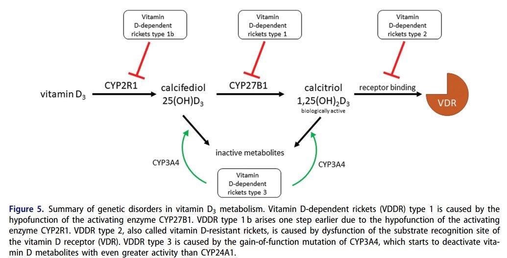 Malfunctions of any mentioned enzyme can cause human disease [155]. With increasing age, the ability of kidneys to activate 25(OH)D3 declines. Also, increased expression of CYP24A1 and increased calcitriol clearance have been described [156-158]. These factors may contribute to age-related bone thinning. Inborn diseases can also affect vitamin D metabolism. Vitamin D- dependent rickets (VDDR) type 1 is caused by an inactivating mutation in the CYP27B1 gene, subsequently leading to insufficient 1 a-hydroxylation and thus reduced activation of 25(OH)D3 [159]. There is also a rare hereditary variant of VDDR called type 1 b in which the loss-of-function mutation occurs in CYP2R1, leading to low levels of 25(OH)D [160]. VDDR type 3 is associated with the gain-of-function mutation in the substrate recognition site of CYP3A4, which thereafter starts to extensively deactivate calcitriol [161]. The mechanisms of vitamin D metabolism-mediated rickets as well as other genetically based rickets are schematically depicted in Figure 5 and summarized in Table 2.