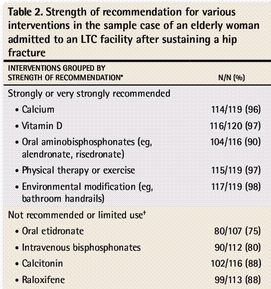 RESULTS?Of the 246 physicians sent the questionnaire, 25 declined study materials and were excluded. Of the 221 remaining, 120 responded for a response rate of 54%. About two-thirds of respondents were family physicians (78 of 120) and the rest were mostly geriatricians. Most respondents strongly recommended the following secondary prevention strategies for use in LTC after hip fracture: calcium, vitamin D, oral aminobisphosphonates, physical therapy, and environmental modification (such as handrails). Most respondents either did not recommend or recommended limited use of etidronate, intravenous bisphosphonates, calcitonin, raloxifene, testosterone (for hypogonadal men), and teriparatide. Postmenopausal hormone therapy was discouraged or not recommended by most respondents. Support was mixed for the use of hip protectors, B vitamins, and folate. Barriers to implementation identified by most respondents included a lack of strong evidence of hip fracture reduction (for B vitamins and folate, cyclic etidronate, and testosterone), side effects (for postmenopausal hormone therapy), poor compliance (for hip protectors), and expense (for intravenous bisphosphonates and teriparatide). Some respondents cited side effects or poor compliance as barriers to using calcium and potent oral bisphosphonates.