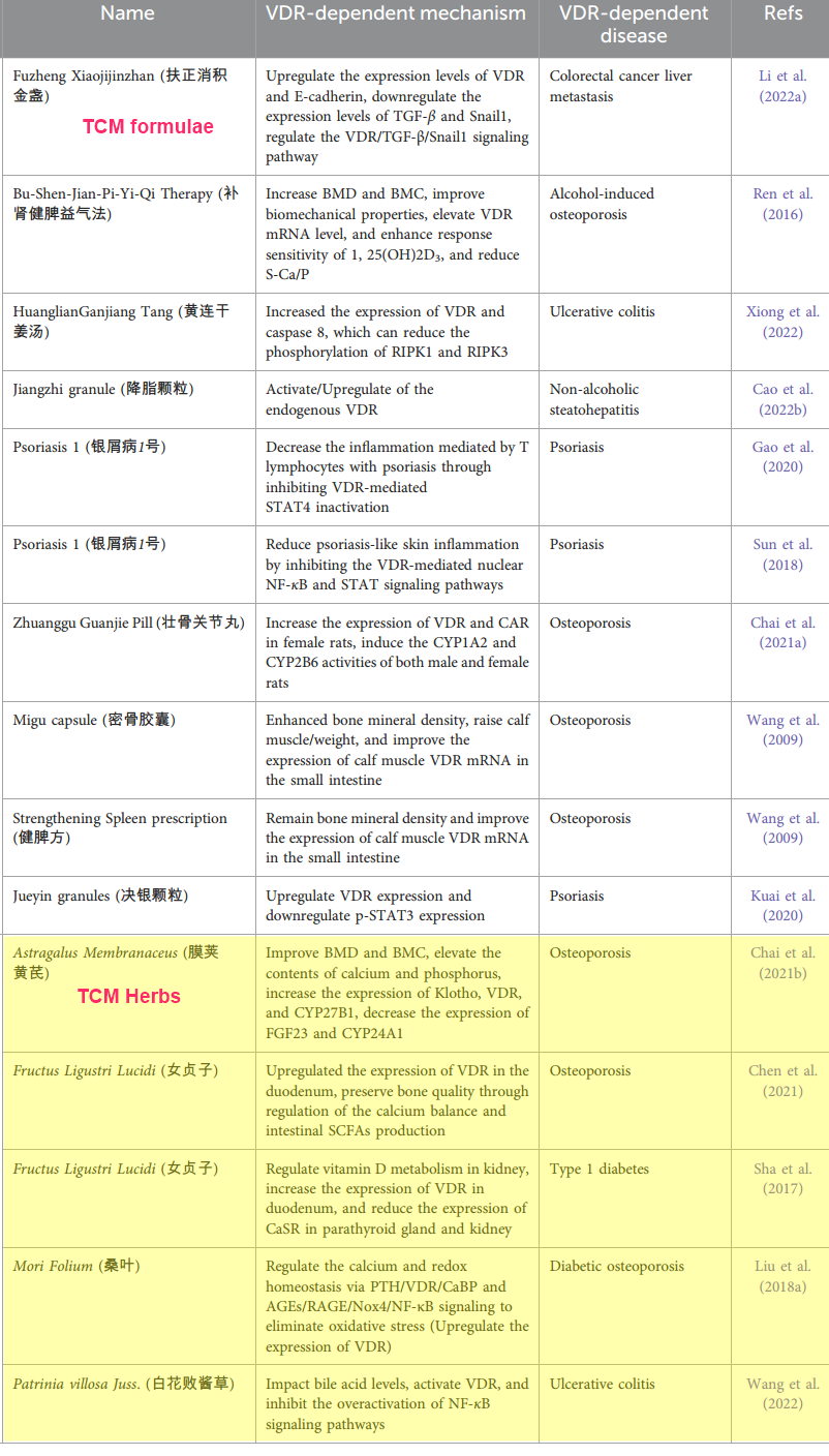 TABLE 1 Traditional Chinese medicine formulas and herbs target VDR activity to improve VDR-dependent diseases.