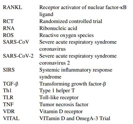 - (mean±SD or overall range), l,25(OH)2D 1,25-hydroxyvitamin D, 25{OH)D 25-hydroxyvitamin D, aHR adjusted hazard ratio, aOR adjusted odds ratio. Cl confidence interval, COVID-19 coronavirus disease 2019, CRP C-reactive protein, GWAS genome-wide association study, HR hazard ratio, ICU intensive care unit, IMV invasive mechanical ventilation, IL-6 interleukin-6, LDH lactate dehydrogenase, NA not applicable, N/L ratio neutrophil/lymphocyte ratio, OR odds ratio, RCT randomized controlled trial, RR relative risk, SARS-CoV-2 severe acute respiratory syndrome coronavirus 2, SD standard deviation, TNF-a tumor necrosis factor-a