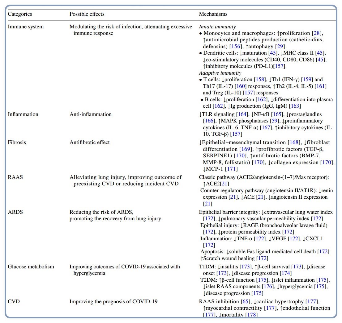 Vitamin D is synthesized in the skin after exposure to ultraviolet B radiation or is obtained from food and supplements. It undergoes 25- and 1a-hydroxylation sequentially in the liver and kidney, respectively, thereby converting it to 1,25-dihydroxyvitamin D (1,25(OH)2D), its biologically active form [25]. Vitamin D and its metabolites can affect SARS-CoV-2 infection and the severity of COVID-19 in several ways (Table 2). These include their effects on the immune system, inflammation, fibrosis, RAAS, acute lung injury, glucose metabolism, and cardiovascular risk.
