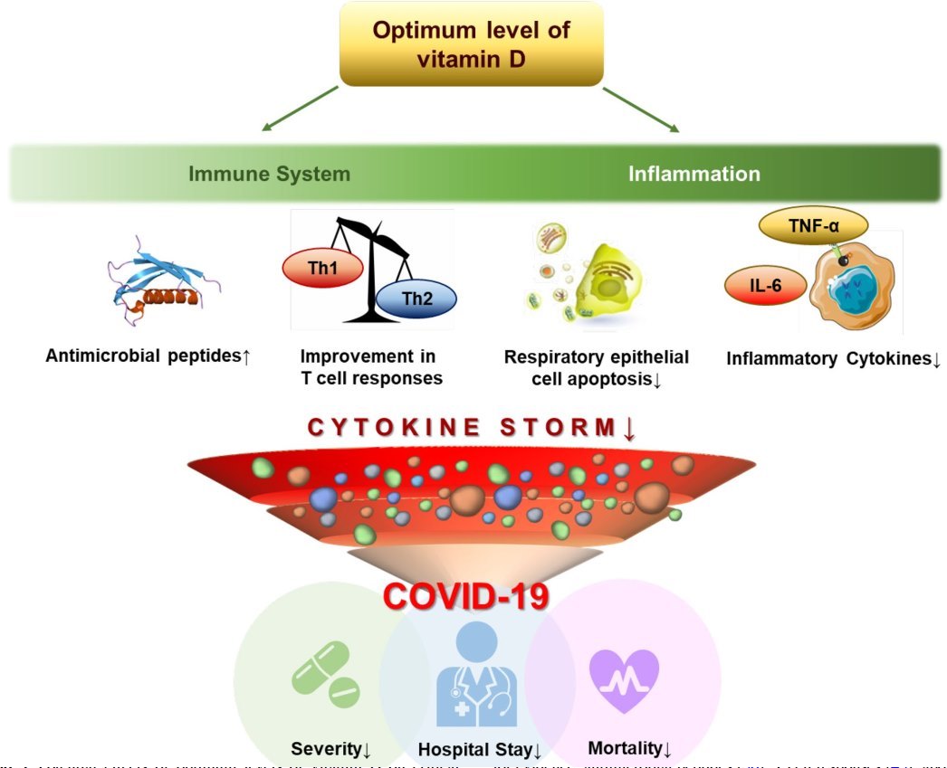 The adaptive immune system in which vitamin D is involved can act as a ‘double-edged sword’ in patients with COVID- 19 [40]. An appropriate immune response to SARS-CoV-2 infection is necessary for viral clearance and mitigates adverse outcomes in patients with COVID-19. However, overproduction of proinflammatory cytokines can contribute to an uncontrolled excessive immune response, known as a cytokine storm [41]. This dysfunctional immune response has detrimental consequences, such as systemic inflammatory response syndrome (SIRS) and multiorgan failure [18].