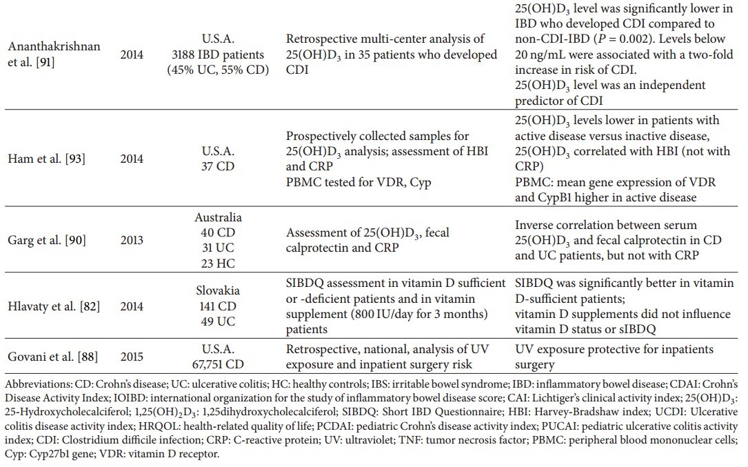The likelihood for developing Clostridium difficile (Cl) colitis related to vitamin D status was investigated retrospectively. There was an increased risk for developing Cl colitis in patients with low plasma 25(OH)D3 levels (<20 ng/mL), and an increase by 1 ng/mL of 25(OH)D3 was accompanied by a 4% risk reduction of developing Cl colitis. Lastly, death from Cl colitis occurred in those with lower 25(OH)D3 levels compared with survivors [91]. A recent study investigated the relationship between 25(OH)D3 concentrations and duration of anti-TNF therapy in IBD patients. Interestingly, low vitamin D levels were associated with loss of response during maintenance therapy in CD patients [92], whereas serum 25(OH)D3 levels increased with anti-TNF therapy [93].