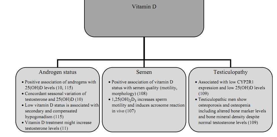 In men, vitamin D status might be related to spermatogenesis, semen quality, and testiculopathies as well as male hypogonadism (see also Fig. 3).