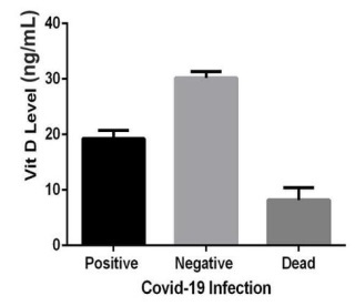 The status ofvitamin D in the four individuals with COVID-19 who deceased in the course of this study was lower than 10 ng/mL. On admission, those individuals had severely low vitamin D levels, significantly less than both the control group and the patients" group, as depicted in Figure la.