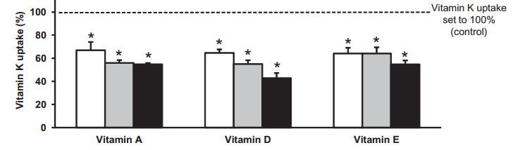 High dose Vitamin D (black bar) reduces by half the uptake of Vitamin K