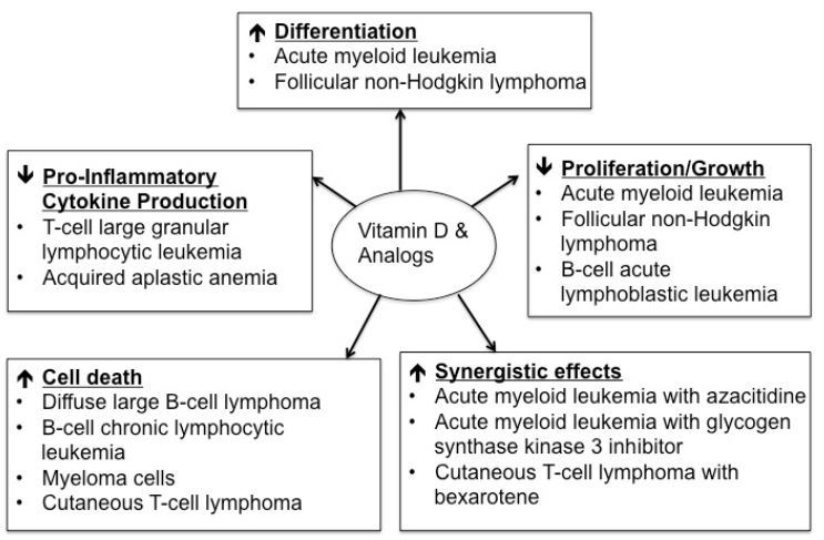 Commonly known for its critical role in calcium homeostasis and bone mineralization, more recently vitamin D has been implicated in haematological cancer pathogenesis and shows promise as an anti-cancer therapy. Serum levels of 25(OH)D3, the precursor to the active form of vitamin D, calcitriol, are typically lower in patients with haematological disease compared to healthy individuals. This often correlates with worse disease outcome. Furthermore, diseased cells typically highly express the vitamin D receptor (VDR), which is required for many of the anti-cancer effects observed in multiple in vivo and in vitro cancer models. In abnormal haematological cells, vitamin D supplementation promotes apoptosis, induces differentiation, inhibits proliferation, sensitizes tumor cells to other anti-cancer therapies, and reduces the production of pro-inflammatory cytokines. Although the dosage of vitamin D required to achieve these effects may induce hypercalcemia in humans, analogs and combinatorial treatments have been developed to circumvent this side effect. Vitamin D and its analogs are well tolerated in clinical trials and thus further investigation into the use of these agents in the clinic is warranted. Here we review the current literature in this field.