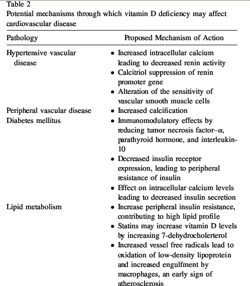 Observational studies strongly associate vitamin D deficiency with a variety of cardiovascular diseases beyond defects in bone and calcium metabolism. Vitamin D has multiple mechanisms that potentially may affect cardiovascular health. Because vitamin D deficiency is common, therapies directed at the replacement of vitamin D may be beneficial. To date however, studies evaluating vitamin D supplementation are few and have not consistently shown benefit. It is possible that the lack of benefit in these studies may have arisen from suboptimal levels of vitamin D supplementation or other unknown factors. Nevertheless, the growing body of observational data and consistent findings of relatively high rates of low vitamin D serum levels warrant further well-designed studies to investigate the relation between vitamin D and cardiovascular health. In conclusion, vitamin D is now recognized as important for cardiovascular health and its deficiency as a potential risk factor for several cardiovascular disease processes. PMID: 20816120