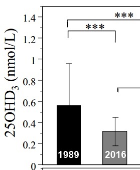 Method: Lactating mothers were recruited from three regions of Japan in 1989 (n = 72) and 2016–2017 (n = 90), and milk from 3–4 months was collected in summer and winter. The samples were strictly sealed and stored at −80℃ until measurement. Breast milk vitamin D and 25OHD concentrations were analyzed by LC-MS/MS. Vitamin D intake, sun exposure, and sunscreen use of the lactating mothers in 2016–2017 were assessed.