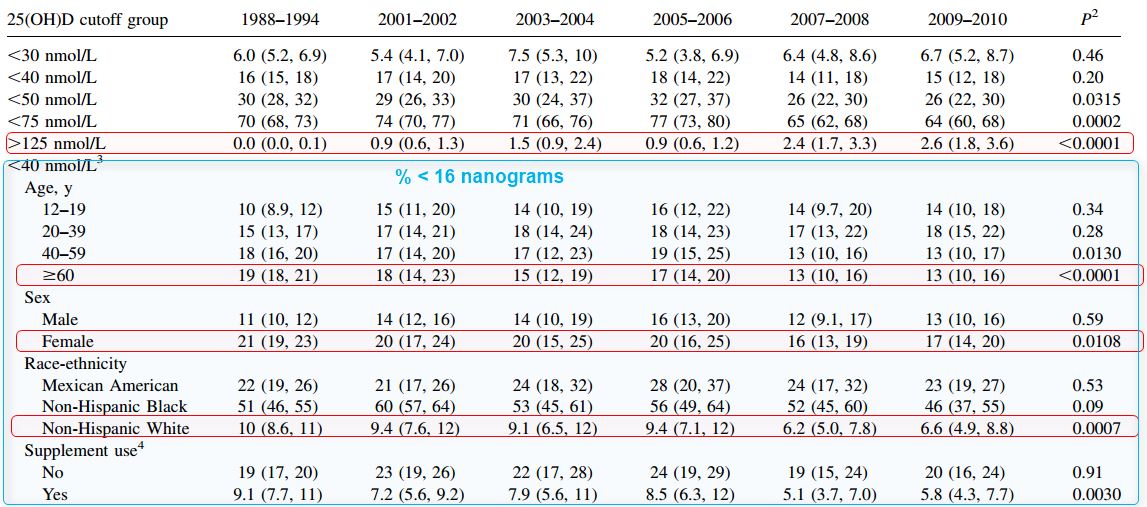 Results: Overall, mean predicted 25(OH)D showed no time trend from 1988 to 2006, but during 2007-2010 the mean measured 25(OH)D was 5-6 nmol/L higher. Those groups who showed the largest 25(OH)D increases (7-11 nmol/L) were older, female, non- Hispanic white, and vitamin D supplement users. During 19882010, the proportions of persons with 25(OH)D <40 nmol/L were 14-18% (overall), 46-60% (non-Hispanic blacks), 21-28% (Mexican Americans), and 6-10% (non-Hispanic whites).