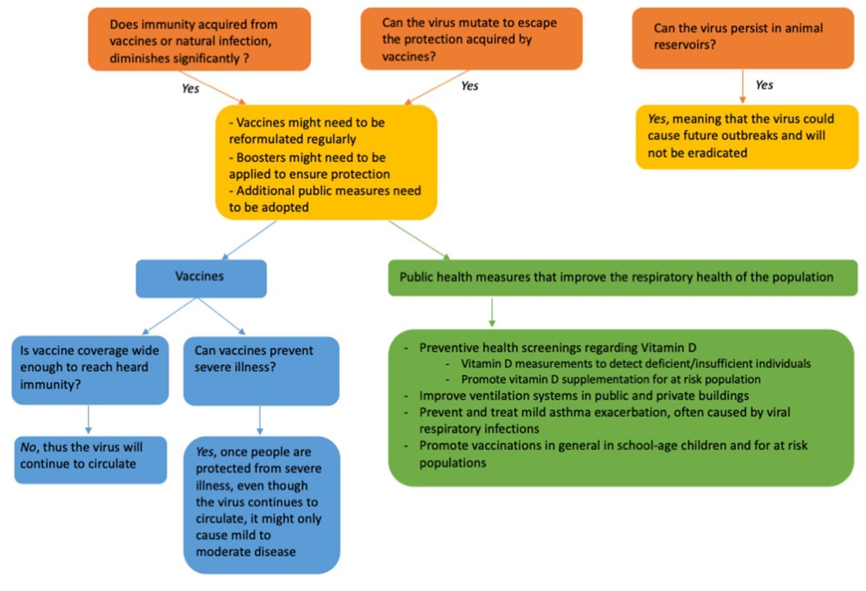 Currently, the common belief in the scientific community is that SARS-CoV-2 will become endemic and will continue to cause outbreaks in regions where it appeared to have been eliminated (2, 3, 132). Therefore, governments should continue to evaluate evidence regarding mitigating strategies that are quick, deployable, cost effective and readily available to fight COVID-19. Among these strategies, we propose that vitamin D supplementation in those who have a vitamin D deficiency or insufficiency can have a role to support protective immune response to SARS-CoV-2, particularly for what concerns the innate immune response, which is not sensitive to COVID-19 variants. Previous experimental and clinical data have shown that vitamin D deficiency increases the risk of ARIs, increases the risk of asthma and exacerbates chronic obstructive pulmonary disease (COPD) (68, 79). Therefore, correcting vitamin D deficiency would improve the overall respiratory health of the population as SARS-CoV-2 becomes endemic and joins other viral respiratory illness such as influenza and respiratory syncytial virus (RSV) (1-3).