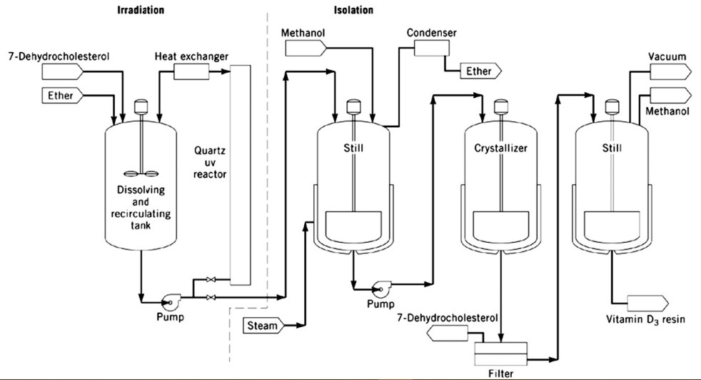 This procedure gave relatively low yields of the product of only about 4% and other methods were sought to improve the conversion of cholesterol into 7- dehydrocholesterol. The Windaus procedure has been improved recently to a point where the procedure is now used currently for a majority of the 7-dehydrocholesterol production.