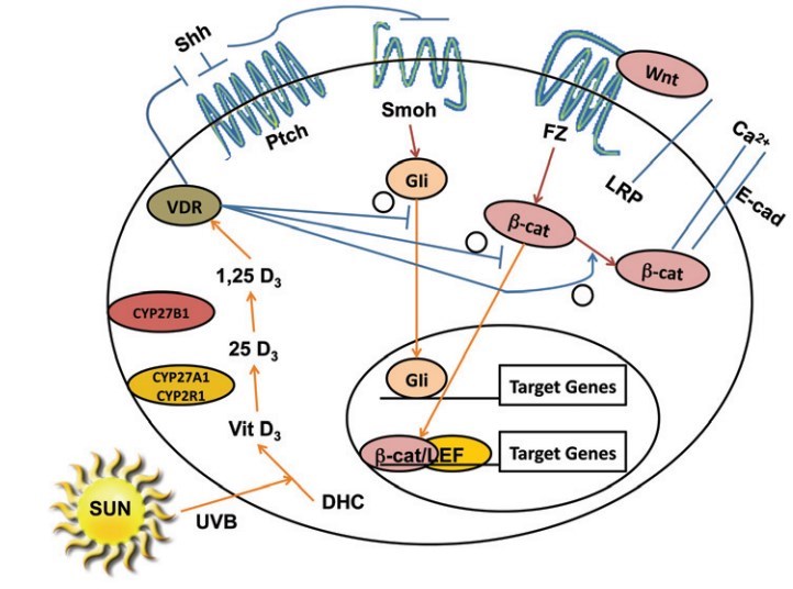 - The first mechanism focuses on the role of vitamin D signaling in keratinocyte proliferation and differentiation. In particular, two pathways affecting proliferation and differentiation, namely the hedgehog and wnt/p-catenin pathways, were evaluated. Mice lacking the VDR have increased expression of the hedgehog pathway and increased activation of the wnt/p-catenin pathway. 1,25(OH)2D suppresses both pathways in cells containing the VDR. Overexpression of the hedgehog and wnt/p-catenin pathways lead to increased proliferation and decreased differentiation associated with tumor development.