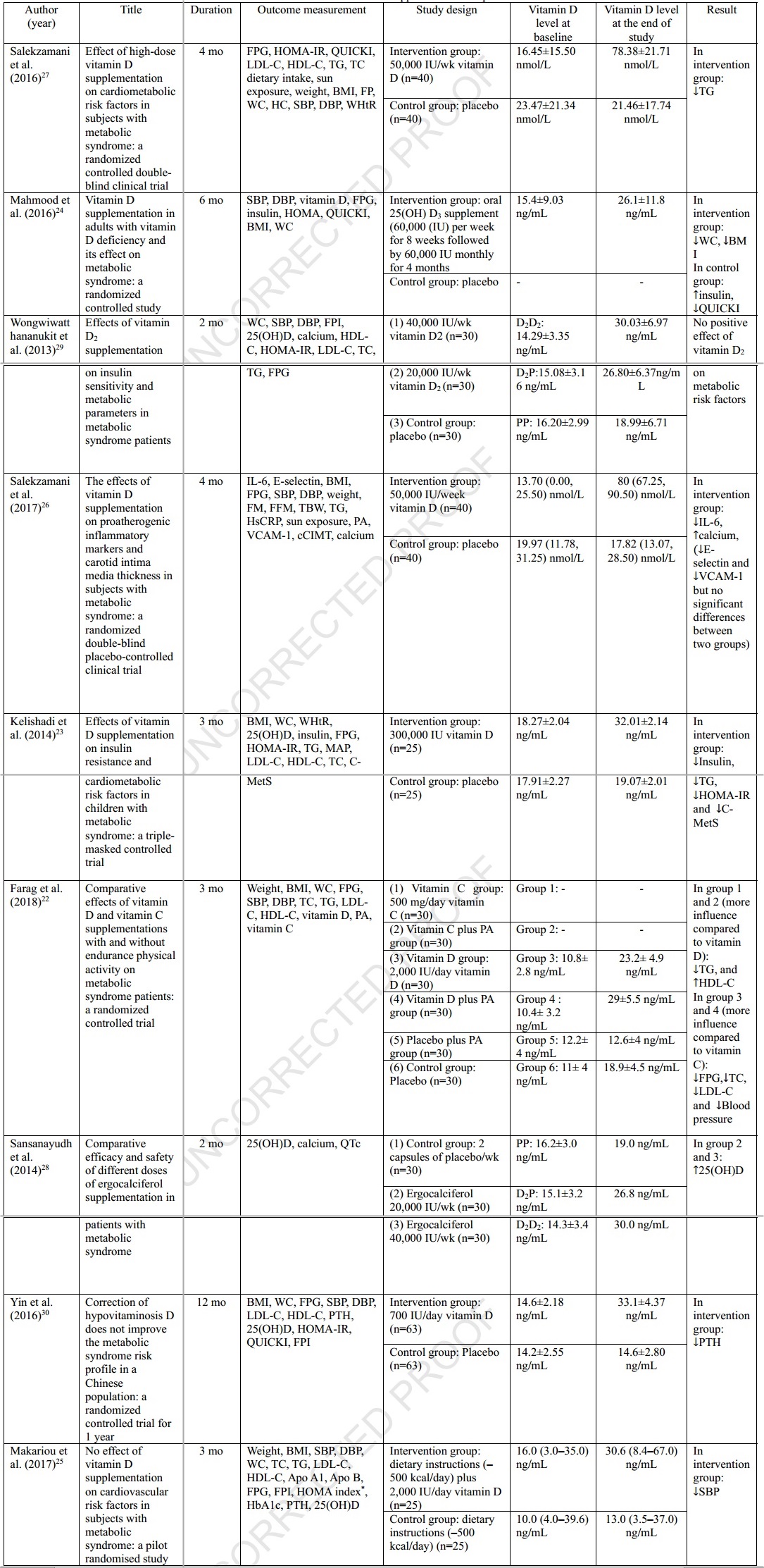 Vitamin D can inhibit the protein expression of nuclear factor beta; improve arterial stiffness; decrease renin-angiotensin-aldosterone system activity, parathyroid hormone levels, inflammatory cytokines, 3-hydroxy-3-methylglutarylcoenzyme A (HMG-CoA)-reductase, and lanosterol 14 β-demethylase enzyme activity; increase the activity of lipoprotein lipase; alter gene expression in C2C12 cells; and improve phospholipid metabolism and mitochondrial oxidation. We tried to elucidate and analyze almost all evidence from randomized controlled trial studies of the efficacy of vitamin D supplementation in patients with MetS. The findings of the present study reported beneficial effects of vitamin D supplementation on mentioned factors. Vitamin D supplementation is recommended in people with vitamin D deficiency even if it has no considerable effect on most MetS factors. However, existing data from interventional studies are insufficient to reach a definitive conclusion about the effect of vitamin D supplementation on MetS components in patients without vitamin D deficiency. Thus, new clinical studies are needed to test the hypothesis that vitamin D supplementation could alleviate MetS components in patients with sufficient intake of vitamin D.