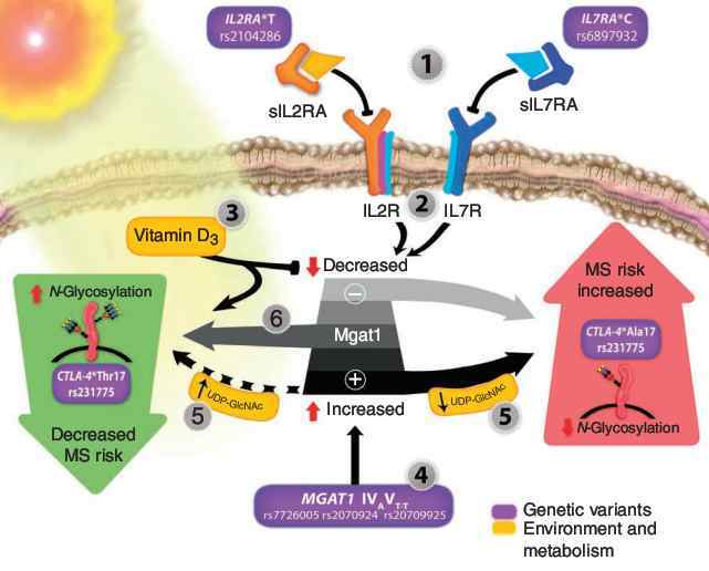 How environmental factors combine with genetic risk at the molecular level to promote complex trait diseases such as multiple sclerosis (MS) is largely unknown. In mice, N-glycan branching by the Golgi enzymes Mgat1 and/or Mgat5 prevents T cell hyperactivity, cytotoxic T-lymphocyte antigen 4 (CTLA-4) endocytosis, spontaneous inflammatory demyelination and neurodegeneration, the latter pathologies characteristic of MS. Here we show that MS risk modulators converge to alter N-glycosylation and/or CTLA-4 surface retention conditional on metabolism and vitamin D3, including genetic variants in interleukin-7 receptor-? (IL7RA*C), interleukin-2 receptor-? (IL2RA*T), MGAT1 (IVAVT?T) and CTLA-4 (Thr17Ala). Downregulation of Mgat1 by IL7RA*C and IL2RA*T is opposed by MGAT1 (IVAVT?T) and vitamin D3, optimizing branching and mitigating MS risk when combined with enhanced CTLA-4 N-glycosylation by CTLA-4 Thr17.