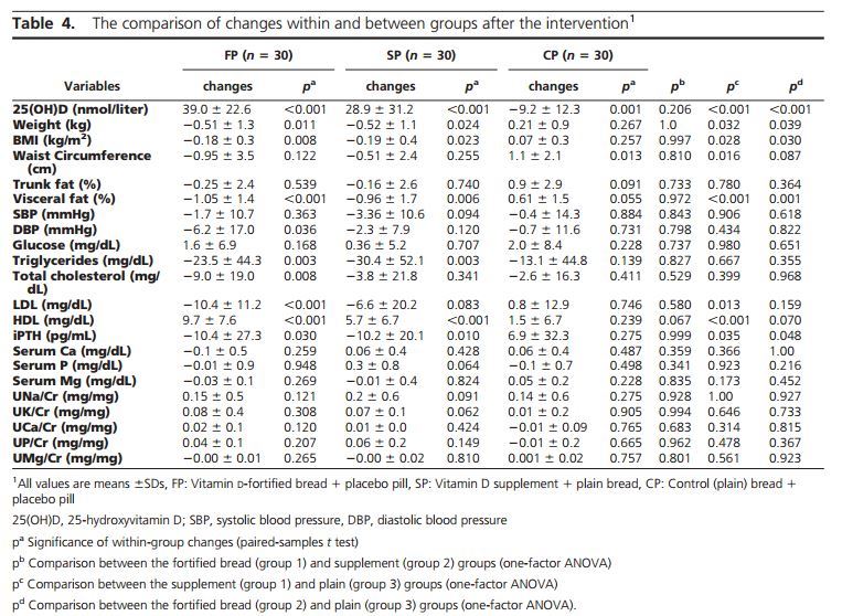 Nikooyeh B1, Neyestani TR1, Zahedirad M1, Mohammadi M2, Hedayat Hosseini S3, Abdollahi Z4, Salehi F4, Mirzay Razaz J5, Shariatzadeh N1, Kalayi A1, Lotfollahi N1, Maleki MR1.VitaminDWiki Summary1000 IU in bread (FP) 1000 IU supplement (SP) Vitamin D changes +16 ng +12 ng IPTH -13% -14% Visceral fat -1% -1% LCL-C -10 mg/L -7 mg/dL