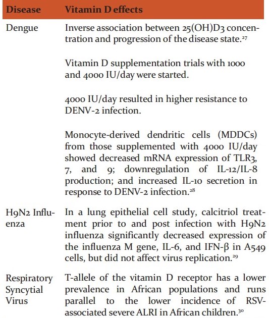 An observational study conducted in Connecticut on 198 healthy adults concluded that concentrations of 38 ng/mL or more were associated with a significant (p < 0.0001) twofold reduction in the risk of developing ARTIs and with a marked reduction in the percentage of days ill.27 Evidence from the effects of vitamin D concentration among viral agents were shown in the following Table 1.