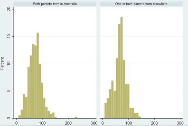 Fig E2. Distribution of vitamin D levels in HealthNuts serum samples by parents’ country of birth (n = 708).