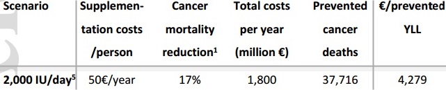 In the main analysis, vitamin D supplementation was estimated to prevent almost 30,000 cancer deaths per year at approximate costs of €900 million and savings of €1.154 billion, suggesting net savings of €254 million.