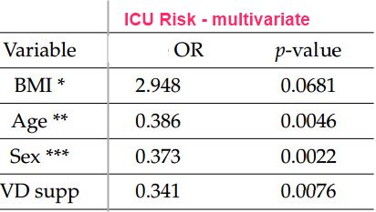 - Vitamin D levels measured in the hospital were not statistically significantly related to any COVID variable