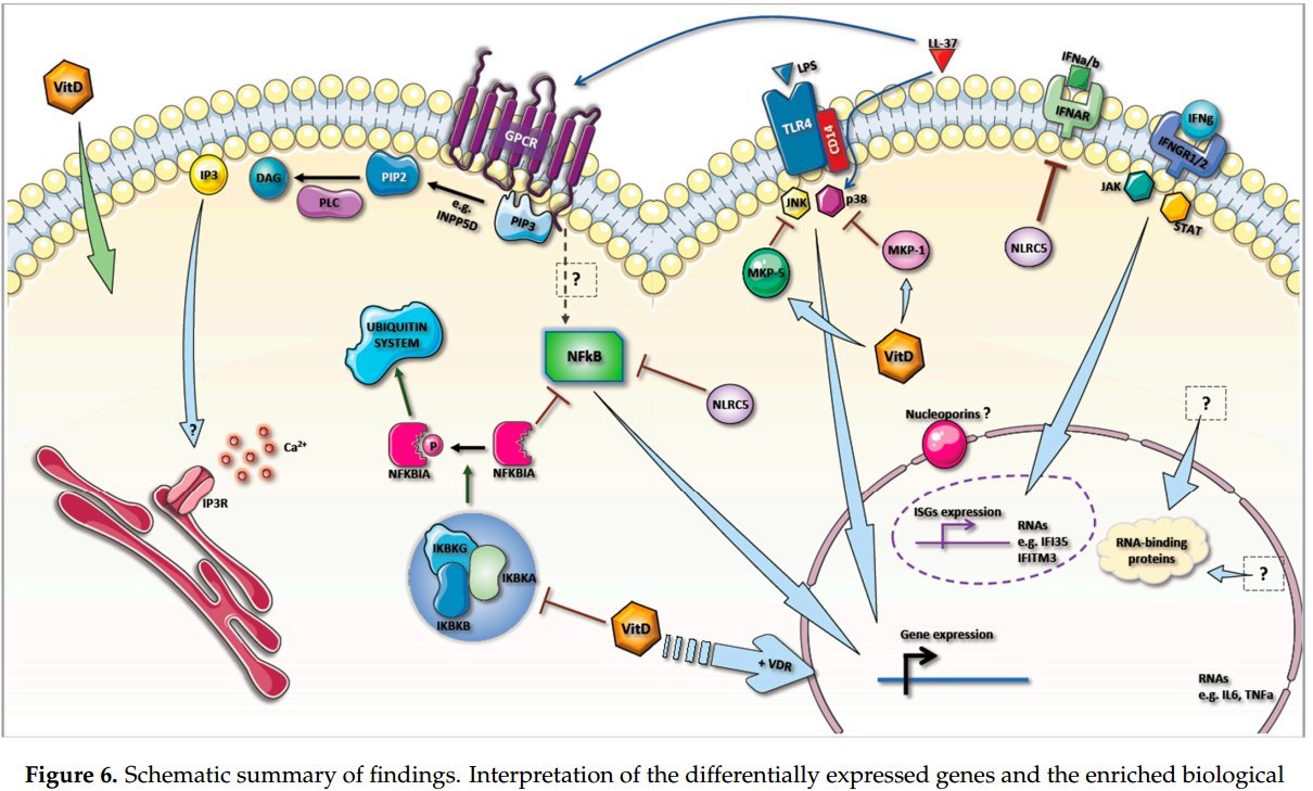 We identified 54 differentially expressed genes that were strongly modulated by vitamin D3 supplementation. Network analyses showed significant changes in the immune-related pathways such as TLR4/CD14 and IFN receptors, and catabolic processes related to NF-kB, which were subsequently confirmed by gene ontology enrichment analyses. We proposed a model for vitamin D3 response based on the expression changes of molecules involved in the receptor-mediated intra-cellular signaling pathways and the ensuing predicted effects on cytokine production. Overall, vitamin D3 has a strong effect on the immune system, G-coupled protein receptor signaling, and the ubiquitin system. We highlighted the major molecular changes and biological processes induced by vitamin D3, which will help to further investigate the effectiveness of vitamin D3 supplementation among individuals in the Middle East as well as other regions.