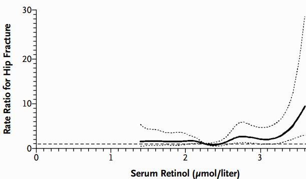 RESULTS: The risk of fracture was highest among men with the highest levels of serum retinol. Multivariate analysis of the risk of fracture in the highest quintile for serum retinol (>75.62 microg per deciliter [2.64 micromol per liter]) as compared with the middle quintile (62.16 to 67.60 microg per deciliter [2.17 to 2.36 micromol per liter]) showed that the rate ratio was 1.64 (95 percent confidence interval, 1.12 to 2.41) for any fracture and 2.47 (95 percent confidence interval, 1.15 to 5.28) for hip fracture. The risk of fracture was further increased within the highest quintile for serum retinol. Men with retinol levels in the 99th percentile (>103.12 microg per deciliter [3.60 micromol per liter]) had an overall risk of fracture that exceeded the risk among men with lower levels by a factor of seven (P<0.001). The level of serum beta carotene was not associated with the risk of fracture.