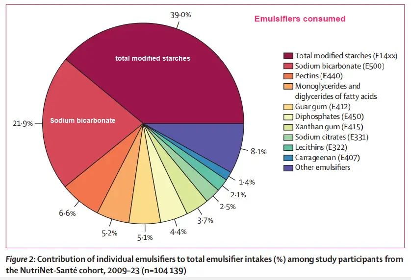 A large prospective cohort study of over 100,000 French adults from the NutriNet-Santé study found that higher intakes of the following emulsifiers were associated with an increased risk of type 2 diabetes: