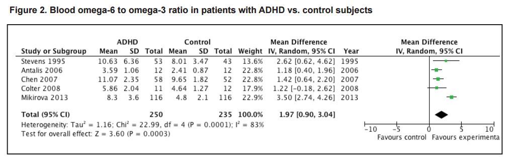 Method: A systematic literature review identified original articles measuring blood n6/n3 or AA/EPA ratio in children and youth with ADHD, compared to controls without ADHD. Three databases were searched. Blood n6/n3, and AA/EPA ratios were compared between individuals with ADHD and controls. Results were pooled across studies using quantitative synthesis.