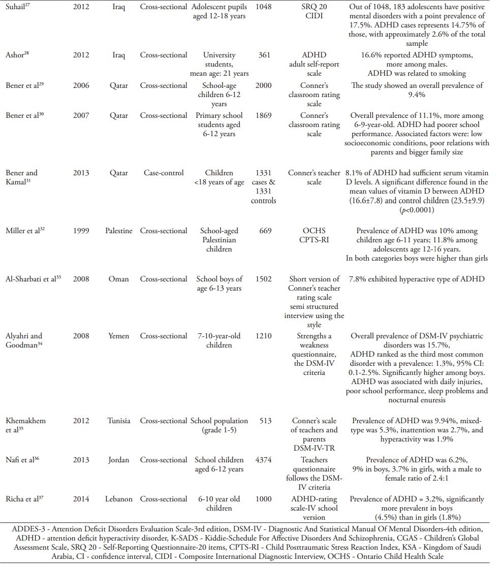 To assess the epidemiology of attention deficit hyperactivity disorder (ADHD) in Arab countries, and identify gaps for future research.