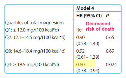 The average total magnesium intake across all patients was 251.0 (184.5–336.5) mg/d, and 321 (70.2%) males and 339 (73.7%) females had insufficient magnesium intake. During a median follow-up period of 5.3 years, 277 deaths occurred. After fully adjusting for confounding factors, total magnesium intake levels were inversely associated with all-cause mortality risk (HR per 1-mg/(100 kcal*d) increase, 0.97; 95% CI, 0.94–1.00; p = 0.017). Participants with the highest quartile of total magnesium intake (≥ 18.5 mg/(100 kcal*d)) had a 40% reduction in all-cause mortality risk compared to those with the lowest quartile (≤ 12.0 mg/(100 kcal*d)) (HR, 0.60; 95% CI, 0.38–0.94; p = 0.024). Stratified analyses showed that this inverse association was statistically significant in those who were older, female, without hypertension, and had smoking, normal renal function, and adequate energy intake. Dietary magnesium intake alone might be not related to all-cause mortality.Conclusions