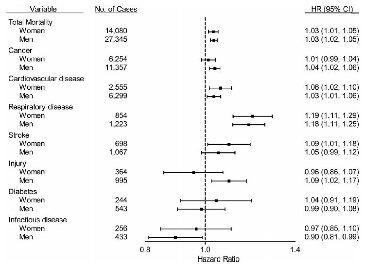 - respiratory disease (HRQ4 vs. Q1 = 1.37, 95% CI: 1.21, 1.55), and