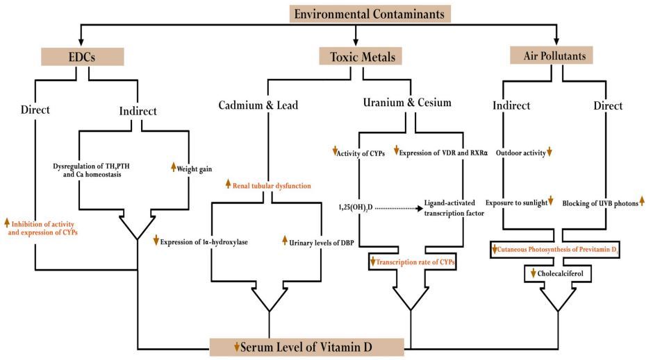 To summarize explanations for these unclear topics, we conducted the present review, using relevant keywords in the PubMed database, to investigate the adverse effects of exposure to air pollution, some environmental chemicals, and smoking on the VD metabolism, and incorporate relevant potential pathways disrupting VD endocrine system (VDES) leading to VDD. Air pollution may lead to the reduction of VD cutaneous production either directly by blocking ultraviolet B photons or indirectly by decreasing outdoor activity. Heavy metals may reduce VD serum levels by increasing renal tubular dysfunction, as well as downregulating the transcription of cytochrome P450 mixed-function oxidases (CYPs). Endocrine-disrupting chemicals (EDCs) may inhibit the activity and expression of CYPs, and indirectly cause VDD through weight gain and dysregulation of thyroid hormone, parathyroid hormone, and calcium homeostasis. Smoking through several pathways decreases serum 25(OH)D and 1,25(OH)2D levels, VD intake from diet, and the cutaneous production of VD through skin aging. In summary, disturbance in the cutaneous production of cholecalciferol, decreased intestinal intake of VD, the modulation of genes involved in VD homeostasis, and decreased local production of calcitriol in target tissues are the most likely mechanisms that involve in decreasing the serum VD levels.