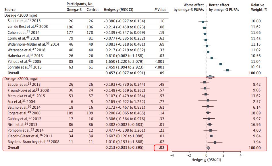 The anxiolytic effect of omega-3 PUFAs was significantly better than that of controls only in subgroups with a higher dosage (at least 2000 mg/d) and not in subgroups with a lower dosage (<2000 mg/d).