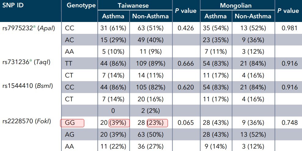 In total, 328 Han Taiwanese subjects and 381 Mongolian subjects were enrolled, and their vitamin D serum levels assayed. Genomic DNA of 178 Han Taiwanese subjects and 90 Mongolian subjects was obtained from blood samples. Single-nucleotide polymorphisms (SNPs) of VDR, ApaI (rs7975232), TaqI (rs731236), BsmI (rs1544410) and FokI (rs2228570), were selected for genotyping. Logistic regression analyses were performed to detect an association between allergic asthma status and the interaction of the VDR SNP and serum vitamin D concentration in the case–control samples.