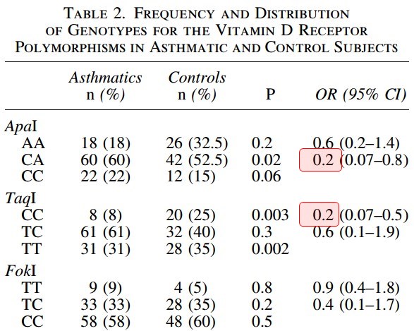 - genotype (CA) of ApaI polymorphisms [OR = 0.2, 95% CI (0.07–0.8), P = 0.02], and asthma risk.