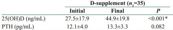 Conclusions: Weekly supplementation with 50,000 IU vitamin D resulted in nearly 17 ng/mL increment in circulating calcidiol. This increase was associated with significant improvement of power leg press and sprint tests in D-supplemented group.