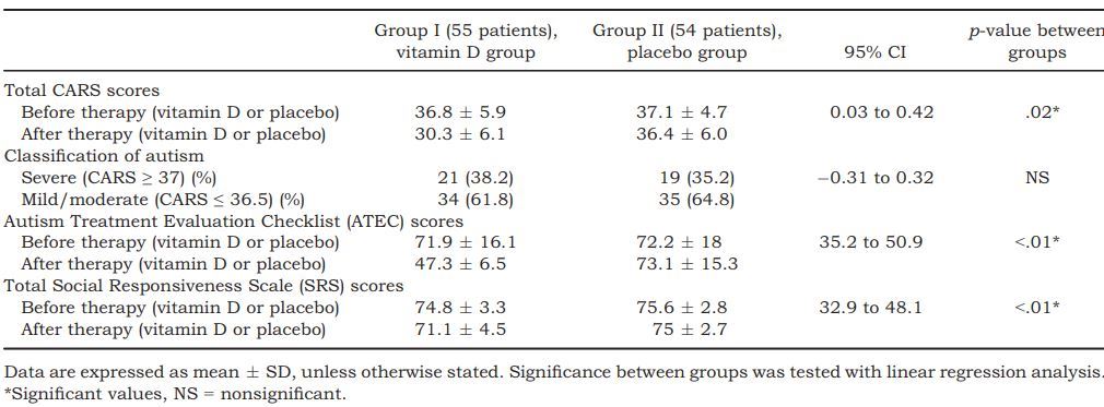 Supplementation of vitamin D was well tolerated by the ASD children. The daily doses used in the therapy group was 300 IU vitamin D3/kg/day, not to exceed 5,000 IU/day. The autism symptoms of the children improved significantly, following 4-month vitamin D3 supplementation, but not in the placebo group. This study demonstrates the efficacy and tolerability of high doses of vitamin D3 in children with ASD.