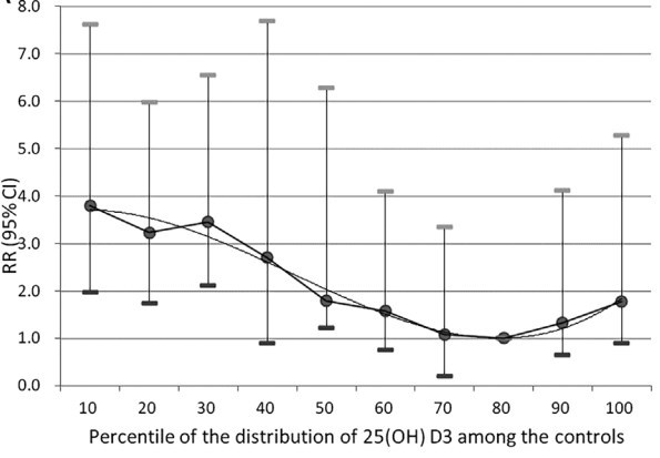 Furthermore, the nonlinear nature of the ID-risk relationship was more prominent when the data were assessed in deciles. This model predicted the lowest relative risk of ID in the 72rd percentile (corresponding to 48.1 nmol/L of 25(OH)D3). Neonatal vitamin D status was significantly associated with the risk of ASDs and intellectual disability. The nature of those relationships was nonlinear.