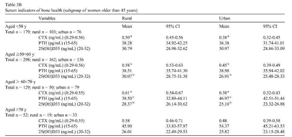 The 25(OH)D3 and C-terminal telopeptide (CTX) levels were significantly higher in the rural vs the urban women older than 50 years. Parathyroid hormone (PTH) levels increased with age in both groups. The 25(OH)D levels were inversely correlated with CTX and PTH in rural women. In urban women, PTH and CTX were correlated while dietary calcium was inversely correlated with CTX and PTH with 25(OH)D3. The combination of low dietary calcium (<230 mg/d), marginally insufficient 25(OH)D3 status, and raised PTH may result in increased bone resorption. Further research is required to assess bone health and fracture risk in black African women.